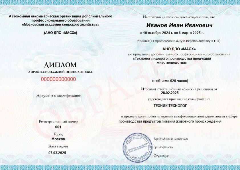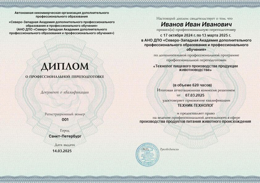 Курс обучения Технолог пищевого производства продукции животноводства (620ч)